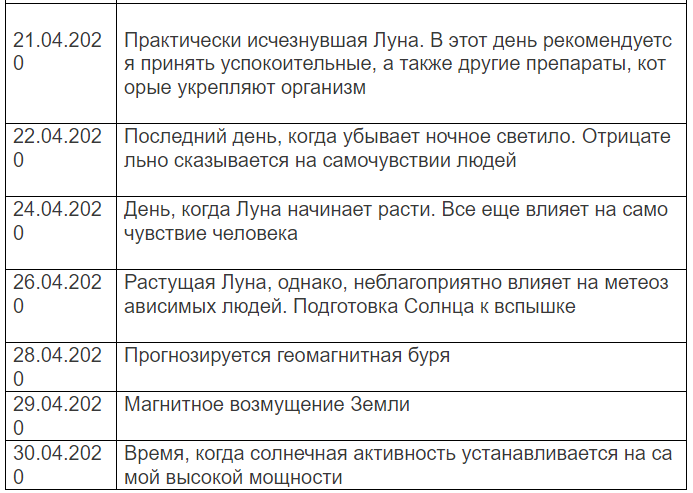 В таблице представлены неблагоприятные дни в апреле 2020 года для метеочувствительных людей. Однако все люди разные, и по-разному реагируют на погодные изменения. Каждый человек, который зависим от солнечной активности, должен наблюдаться у врача. Доктор сможет назначить правильное лечение с применением эффективных препаратов, которые позволят минимизировать негативные последствия от магнитной бури.