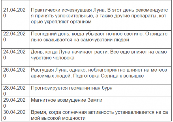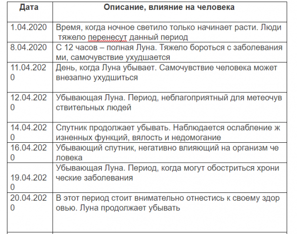 Для того, чтобы метеочувствительные люди могли следить за неблагоприятными днями в апреле 2020 года, составлена таблица, в которой описаны даты, наиболее отрицательно влияющие на организм человека, а также фазы Луны.