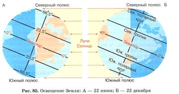 1. Зависимость климата от географической широты. Солнечные лучи, попадая на земной шар под разным углом, по-разному согревают его поверхность. Неравномерно нагревается и воздух. Самый большой угол падения солнечных лучей на земную поверхность в тропическом поясе, следовательно, он получает больше всего тепла. Чем дальше от экватора, тем меньше угол падения солнечных лучей на земную поверхность, а значит, воздух нагревается меньше. В умеренных поясах летом тепло, а зимой температура падает ниже 0 С. Полярные пояса имеют холодный климат.