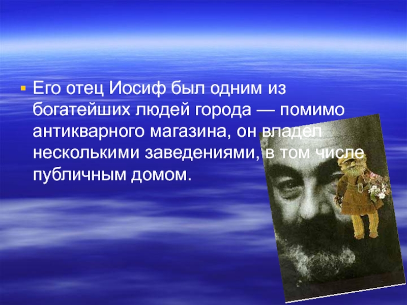 Его отец Иосиф был одним из богатейших людей города — помимо антикварного магазина, он владел несколькими заведениями, в том числе публичным домом.
