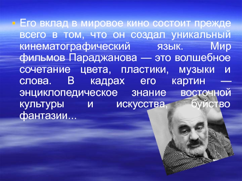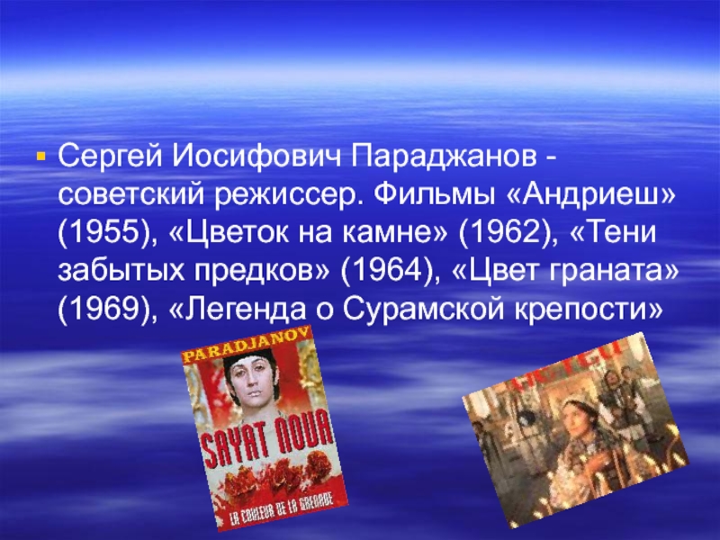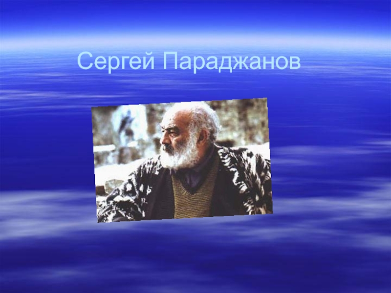 Презентация на тему Презентация на тему Сергей Параджанов, предмет презентации: Образование. Этот материал содержит 10 слайдов. Красочные слайды и илюстрации помогут Вам заинтересовать свою аудиторию. Для просмотра воспользуйтесь проигрывателем, если материал оказался полезным для Вас - поделитесь им с друзьями с помощью социальных кнопок и добавьте наш сайт презентаций ThePresentation.ru в закладки!