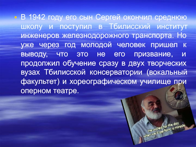 В 1942 году его сын Сергей окончил среднюю школу и поступил в Тбилисский институт инженеров железнодорожного транспорта. Но уже через год молодой человек пришел к выводу, что это не его призвание, и продолжил обучение сразу в двух творческих вузах Тбилисской консерватории (вокальный факультет) и хореографическом училище при оперном театре.
