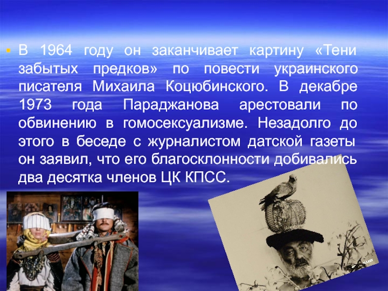 В 1964 году он заканчивает картину «Тени забытых предков» по повести украинского писателя Михаила Коцюбинского. В декабре 1973 года Параджанова арестовали по обвинению в гомосексуализме. Незадолго до этого в беседе с журналистом датской газеты он заявил, что его благосклонности добивались два десятка членов ЦК КПСС.