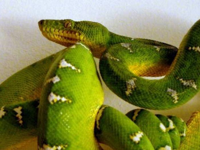 Не смотря на общее внешнее сходство, анаконда отличается от остальных видов удавов и от питонов. Все эти змеи относятся к отряду Чешуйчатых, но удав представитель семейства ложноногих, а питон из семейства питонов. Все они не ядовиты и используют один способ поглощения пищи, глотать добычу целиком. Удавы обитают в основном в Европе и Азии, хотя встречаются на Мадагаскаре, на островах Фиджи и в Новой Гвинее. Их существует около 60 видов. Вот так выглядит изумрудный удав.