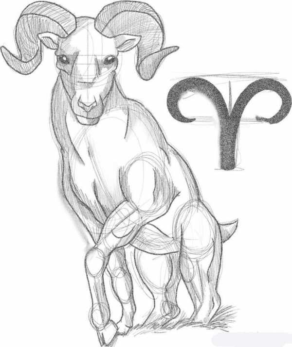 Учимся рисовать и узнаем в этом уроке как нарисовать знак зодиака Овен. Хорошо, начнем этот пошаговый учебник, растягивая руководящие принципы и формы барана и символа. Во-первых нарисовать идеальный круг для формы головы, а затем добавить руководящие принципы для лица, как и загнутые линии для своих рогов.