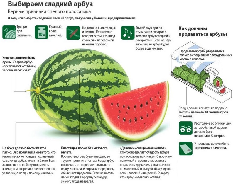 Очень важно уметь правильно выбирать эту ягоду. Лучше всего не надеяться на дядю-продавца, что он подсунет Вам хороший арбуз, а самому поучаствовать в процессе. Для этого следующая памятка Вам в помощь.