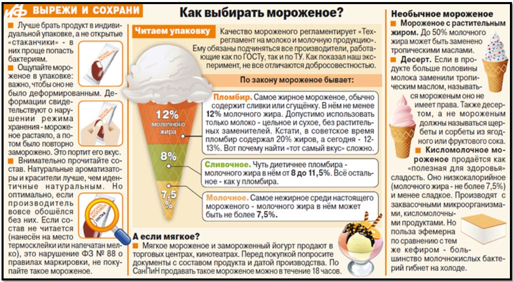 Ледяной островок свежести и вкуса. Да, мороженое не утоляет жажду, да, оно сладкое и после него хочется пить, но когда как не знойным летом его есть? Поэтому добавляем его также в свою продуктовую корзину. Оказывается, мороженое еще нужно уметь правильно выбирать, поэтому следующая памятка Вам пригодится.