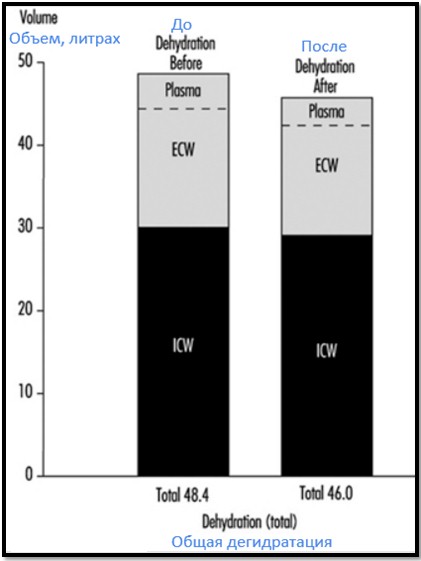 Если говорить о тренировках в зале в летний период, то необходимо всегда помнить о следующем рисунке - расчетное перераспределение воды в внеклеточном (ECW) и внутриклеточном (ICW) пространстве до и после 2часов упражнений при температуре +30 градусов.