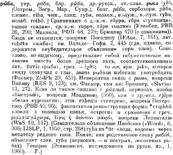 РЫБА ж. рыбка, рыбочка, рыбушка, рыбица, рыбонька; рыбчонка, рыбешка; рыбина (одна), рыбища, водяное животное с холодною алою кровью, жабрами (заместо легких), с чешуйчатою или нагою кожею; мечет икру (ест немного живородных). Главное деление этого класса: костистые и хрящйстые, или, как у нас их зовут: черная и красная рыба. Голова рыбы: башка; щека: мыс, шагла, щегла; язык: тумак; затылок: хрупалка, захрустовица; хвост: плеск, махалка; желудок: тамак; брюхо: тёжка; порошица: нарост, норост; чешуя: клёск; слизь: слён и слень; под брюхом красное перо, на плеску махалка. Рыба мечет, бьет или выбивает икру. Красная рыба вскатывается, переваливается, выказывая хребет. Рыба живет, арх. ловится; отжила, лов кончен. Рыба идет на полуводе, полуводой, посредине глубины. Рыба клюет, берется на удочку. Рыба уснула, умерла. Стая рыб, руно, юрово. - яловая, без икры. - кислая, тухлая. - снулая, мертвая. || Рыбы, последний, 12-й знак солнопутья, и созвездие это. || Рыбка, игра: кто водит, держится за веревочку у кола, и сторожит жгуты или ошметки; что растащат, тем его стегают, а кого он запятнает, засалит ногой, тот идет на его место. || Рыбки, астрх. две пластинки мяса, у почек; у барана: хурдинки. Мы с то¬бой как рыба с водой. Не все с рыбкою, ино с репкою. Рыба не хлеб, ею сыт не будешь (чувашек.). Дал Бог рыбу, даст и хлеба (архн. промышл.). Была бы рыба, а хлеб будет (то же). Ушица вместе, а рыбка в деле <дел, в дележ). Ни рыба ни мясо, ни кафтан, ни ряса. Кит-рыба под землей дрожит или на другой бок переваливается (землетрясение). Не учи рыбу плавать. Ловися рыбка малая и большая! Рыба в реке - не вруке