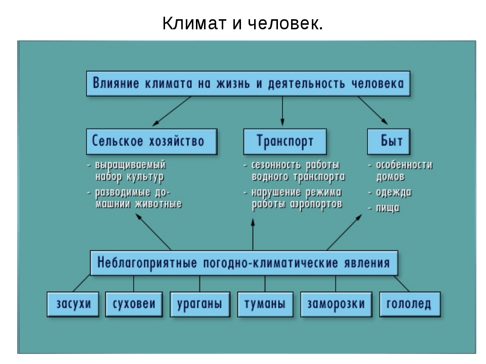 Как фактор природной среды климат влияет на географическое распределение растительности, почв и водных ресурсов и, следовательно, на землепользование и экономику. Различное влияние климата на жизнь, самочувствие, привычки и работу человека хорошо известны. Суровый и холодный климат оказывает неблагоприятное влияние на человека. Наука, которая изучает воздействие климата на здоровье человека, называется климатологией. Климат может влиять на человека прямо и косвенно. Причем основные действия на организм оказывают внезапные, резкие изменения климатических условий.