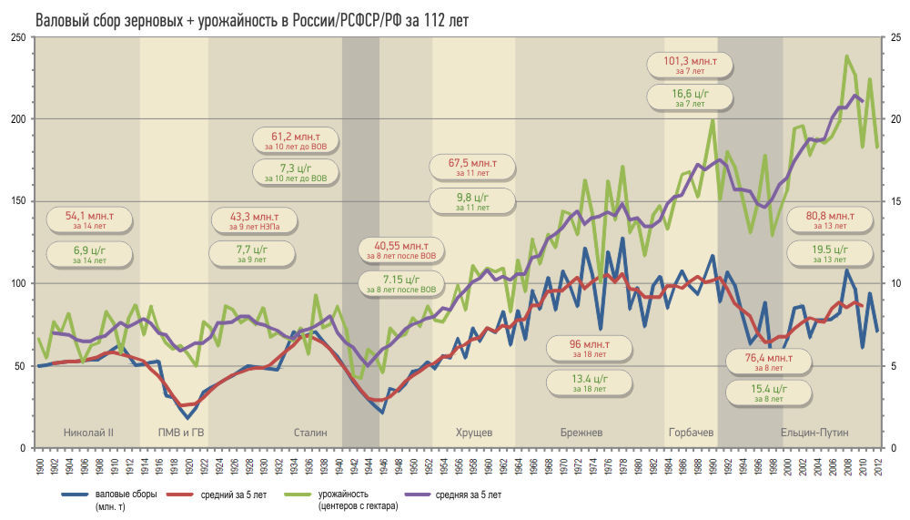 Вот такую историю России в миниатюре рисует нам кривая урожайности. Если подумать, совпадение тенденций развития сельского хозяйства и всего общества совсем не удивительно.