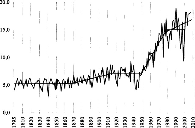 Урожайность и совокупный валовой сбор культур в России меняются не совсем одинаково. Рассмотрим динамику более подробно. До Второй мировой войны показатель урожайности и валового сбора оставался неизменным, испытывая лишь локальные колебания. Затем начался быстрый взлет обоих показателей. Начиная с 1970 года валовой сбор перестал увеличиваться, тогда как урожайность продолжала расти, хотя и более медленными темпами. Это говорит о начале сокращения сельскохозяйственных площадей.