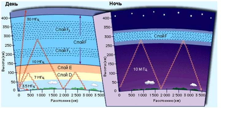 Магнитные бури в высоких широтах могут практически полностью блокировать радиосвязь на несколько суток. При этом, естественно, замирают и многие другие сферы деятельности, например авиасообщение. Именно поэтому все службы, активно использующие радиосвязь, ещё в середине XX века стали одними из первых реальных потребителей информации о космической погоде. Например, днём приём на средних волнах (длина волны от 1 000 до 100 метров) осуществляется за счёт волны вдоль поверхности Земли и составляет по дальности около 500 км, а ночью с учётом ионосферной волны дальность увеличивается до 3 000 км. Наилучшими, с точки зрения антифединговых свойств, являются вертикальные антенны больших размеров с относительной длиной (отношение высоты антенны к длине волны) h / λ = 0,53. Излучение этих антенн под углами ∆ > 45. 50° ничтожно мало. Такие антенны позволяют в 2. 2,5 раза увеличить зону уверенного приёма по сравнению с короткой антенной, имеющей относительную длину h / λ = 0.25. В зависимости от космической погоды возникает явление перекрёстной модуляции.