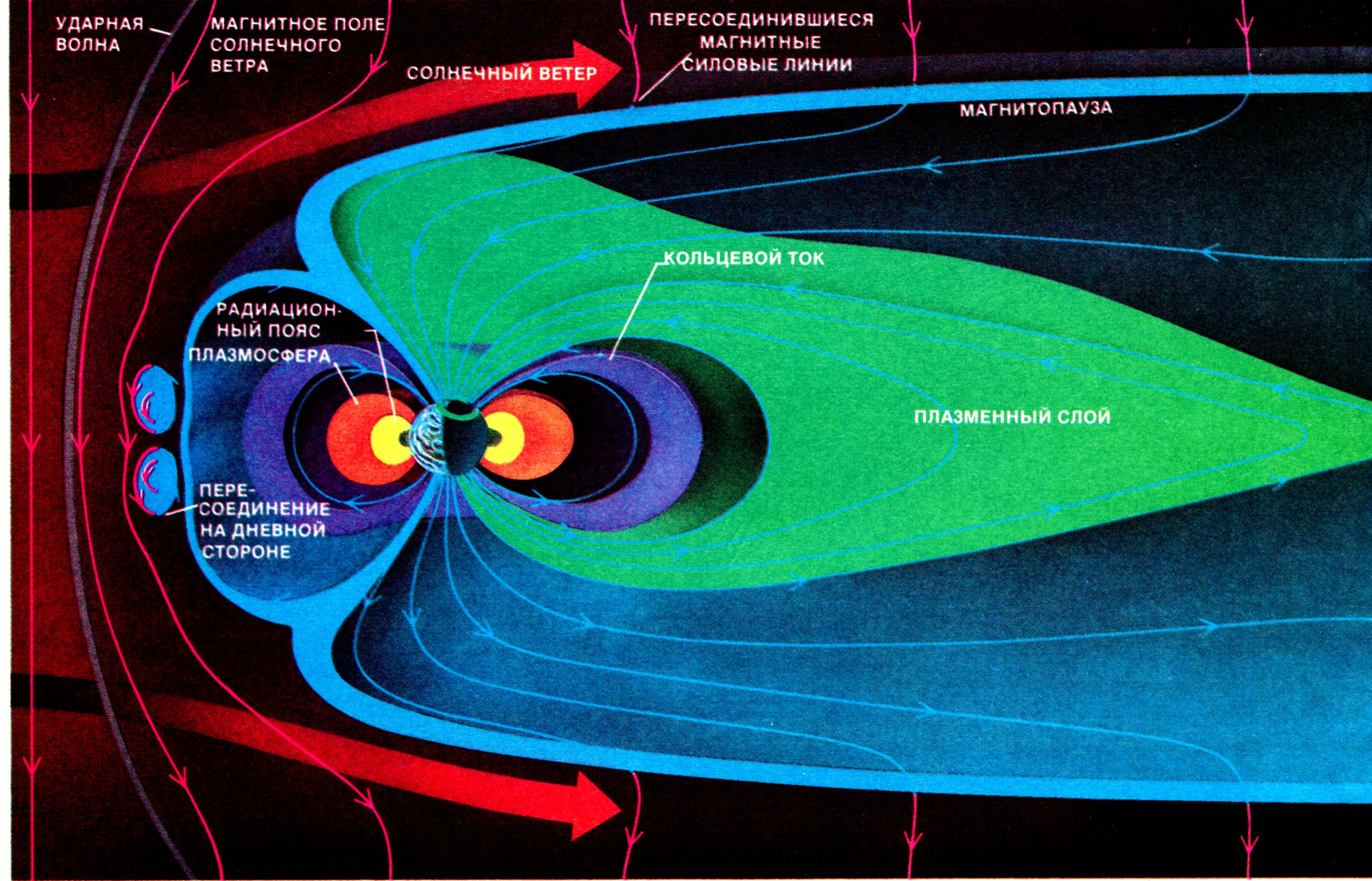 Постепенно усилится солнечный ветер, оказывая давление на магнитосферу, на её замкнутую часть, которая, независимо от вращения Земли, постоянно обращена в сторону Солнца. С дневной стороны магнитосфера начнёт сжиматься, станут сближаться и изгибаться магнитные силовые линии. С противоположной стороны магнитосфера имеет длинный разомкнутый хвост из магнитных линий, уходящих за орбиту Луны. Земля как вещественное тело вращается внутри не вращающейся магнитосферы, постоянно смотрящей своей замкнутой частью на Солнце.