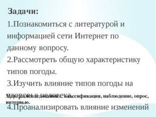 Методы исследования: классификация, наблюдение, опрос, интервью. Задачи: 1.Познакомиться с литературой и информацией сети Интернет по данному вопросу. 2.Рассмотреть общую характеристику типов погоды. 3.Изучить влияние типов погоды на здоровье человека. 4.Проанализировать влияние изменений погоды на посещаемость учащихся МБОУ «Сухосолотинская ООШ» занятий в один из весенних месяцев (март). 5.Провести анкетирование среди учащихся 6-9-х классов и учителей школы по теме: «Влияние погодных условий на здоровье» 6.Подготовить практические советы в случае резкого изменения погоды