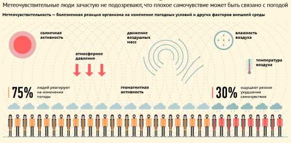 Чувствительность человека к условиям погоды – смене ветра, геомагнитным бурям – называют метеозависимостью. Влияние атмосферного давления на артериальное давление человека до конца еще не изучено. Известно, что при смене погодных условий создаётся внутреннее напряжение внутри сосудов и полостей организма. Метеозависимость может быть выражена: