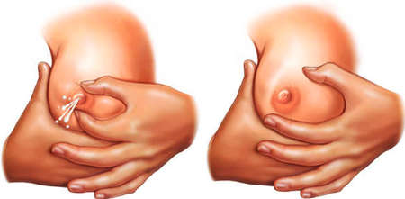 Грудь следует держать большим и указательным пальцами и только немного надавливать большим и указательным пальцем по точному направлению к грудной клетке. Прочие пальцы должны поддерживать грудь. Надавливание на млечные синусы должно быть аккуратным и ни в коем случае не сильным и не резким.