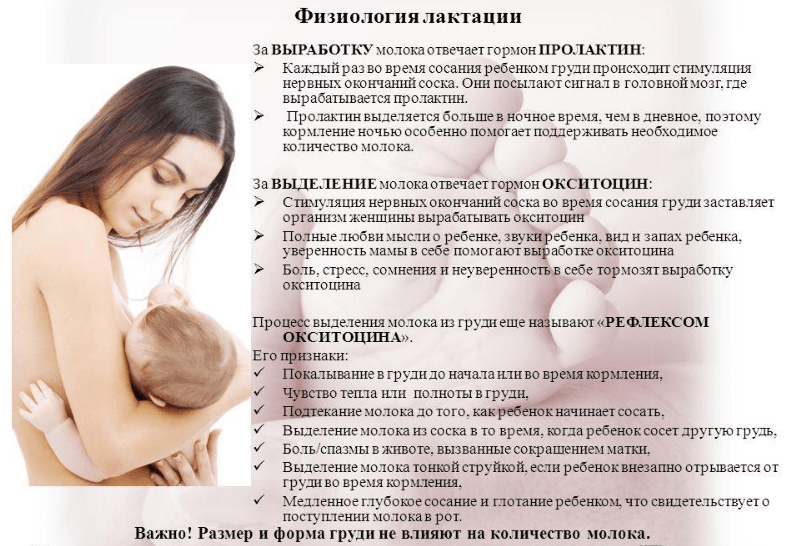 На приток и образование ценного продукта влияют два гормона: окситоцин и пролактин. Появляются они при стимуляции железы методом сосания. Учеными доказано, что сокращение мышечных волокон, которое обеспечивает движение по молочным каналам питательной жидкости, провоцируют даже мысли о своем малыше, его запах или звуки лепета, плача.