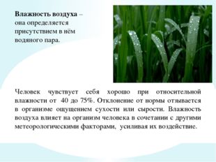 Влажность воздуха – она определяется присутствием в нём водяного пара. Человек чувствует себя хорошо при относительной влажности от 40 до 75%. Отклонение от нормы отзывается в организме ощущением сухости или сырости. Влажность воздуха влияет на организм человека в сочетании с другими метеорологическими факторами, усиливая их воздействие.