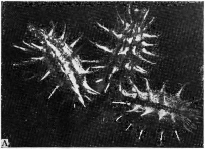 Животные играют важную роль в распространении зачатков растений - плодов, семян, спор. Явление зоохории имеет определенные экологические закономерности и выражено по- разному, в зависимости от местообитания растения и характера его контактов с животным-переносчиком. Растения открытых мест чаще образуют эпизоохорные семена и плоды, разносимые на поверхности тела животного, и в соответствии с этим плоды и семена имеют различные приспособления для закрепления и удержания (крючки, выросты, прицепки и т. д.), например, лопухи большой и паутинистый - Arctium lappa, A. tomentosum, липучка обыкновенная- Lappula myosotis и др. (рис. 180). У некоторых видов (например, у якорцев наземных - Tribulus terrestris или южноафриканского растения - Harpagophyton procumbens) на плодах развиты острые шипы, которые вонзаются в ноги животных (рис. 180, В).
