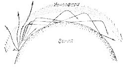 Рис. 148. Волна идет между Землей и ионосферой Наличие таких слоев дало основание к тому, чтобы назвать верхние слои земной атмосферы ионосферой. Присутствие ионов и свободных электронов придает ионосфере свойства, резко отличающие ее от остальной атмосферы. Сохраняя способность пропускать видимый свет, инфракрасное излучение и метровые радиоволны, ионосфера сильно отражает более длинные волны; для таких волн (l больше 10—15 м) земной шар оказывается окруженным как бы сферическим «зеркалом», и распространение этих радиоволн происходит между двумя отражающими сферическими поверхностями — поверхностью Земли и «поверхностью» ионосферы (рис. 148). Именно поэтому радиоволны получают возможность огибать земной шар. Конечно, не следует понимать слова «поверхность сферического зеркала ионосферы» буквально. Никакой резкой границы у ионизованных слоев нет, правильная сферическая форма тоже не соблюдается (по крайней мере, одновременно вокруг всего земного шара); ионизация различна в разных слоях (в верхних она больше, чем в нижних), и сами слои состоят из непрерывно движущихся и меняющихся «облаков». Такое неоднородное «зеркало» не только отражает, но и поглощает и рассеивает радиоволны, причем опять-таки различно в зависимости от длины волны. Кроме того, свойства «зеркала» меняются с течением времени. Днем при действии солнечного излучения ионизации значительно больше, чем ночью, когда происходит только воссоединение положительных ионов и отрицательных электронов в нейтральные молекулы (рекомбинация). Особенно велико различие в ионизации днем и ночью в нижних слоях ионосферы. Здесь плотность воздуха выше, столкновения между ионами и электронами происходят чаще и рекомбинация протекает более интенсивно. В течение ночи ионизация нижних слоев ионосферы может успеть упасть до нуля. Ионизация различна и в зависимости от времени года, т. е. от высоты подъема Солнца над горизонтом. Рис. 149. Различные пути волны от передатчика к приемнику Изучение суточных и сезонных изменений состояния ионосферы позволило не только объяснить, но и предсказывать условия прохождения радиоволн различной длины в разное время суток и года (радиопрогнозы). Наличие ионосферы не только делает возможной коротковолновую связь на большие расстояния, но и позволяет радиоволнам иногда обогнуть весь земной шар, и даже несколько раз. Из-за этого возникает своеобразное явление при радиоприеме, так называемое радиоэхо, при котором сигнал воспринимается приемником несколько раз: после прихода сигнала по кратчайшему пути от передатчика могут быть слышны повторные сигналы, обогнувшие земной шар. Часто случается, что волна доходит от передатчика к приемнику по нескольким различным путям, испытав различное число отражений от ионосферы и земной поверхности (рис. 149). Очевидно, волны, идущие от одного и того же передатчика, когерентны и могут интерферировать в месте приема, ослабляя или усиливая друг друга в зависимости от разности хода. Так как ионосфера не является абсолютно устойчивым «зеркалом», а меняется с течением времени, то меняется и разность хода волн, пришедших по разным путям от передатчика к приемнику, в результате чего усиление колебаний сменяется их ослаблением, потом опять усилением и т. д. Можно сказать, что интерференционные полосы «ползают» над 