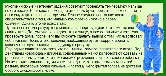 Подковавшись немного с помощью советов на форумах, современные родители приходят к выводу, что ребенка нельзя переохлаждать и перегревать, а также что существует золотое правило: ребенка следует одевать, как себя + 1 слой.