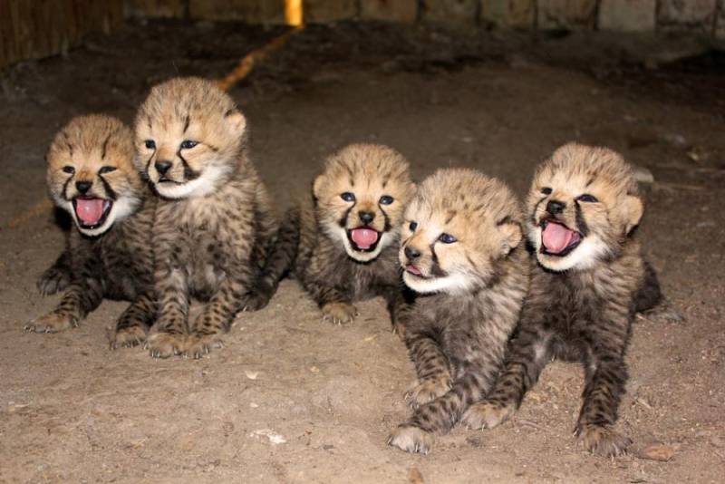 Беременность самки гепарда длится от 85 до 95 суток, в результате на свет появляется от 2 до 4-5 котят. Детеныши гепарда рождаются слепыми и совершенно беспомощными. Лишь через 10-14 дней у малышей открываются глаза. Шерсть маленьких гепардят довольно длинная и отличается серовато-голубым оттенком, характерные пятнышки на шкуре появляются позже.