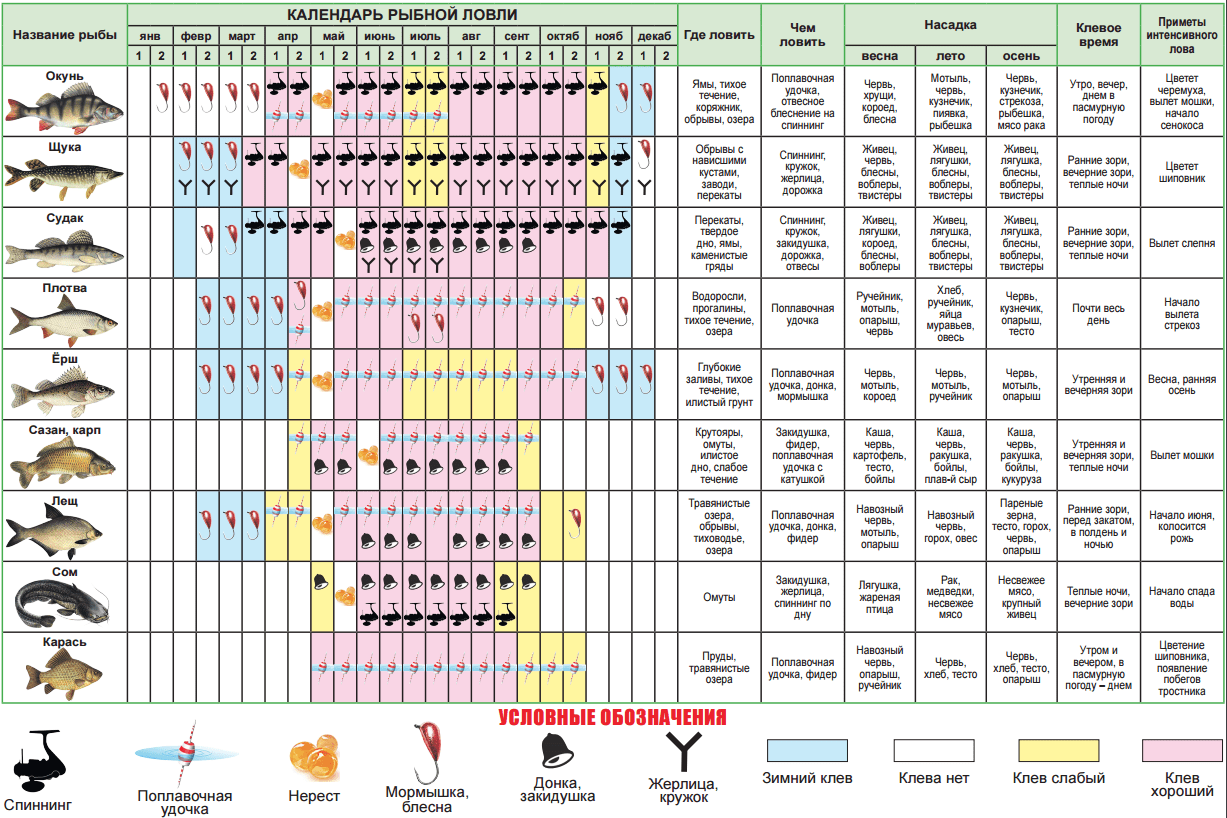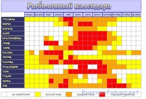 Здесь в таблице наглядно показано лучшее время для ловли рыбы (бычок, голавль, густера, жерех, карась, красноперка, лещ, линь, налим, окунь, пескарь, плотва, подуст, рыбец, сазан, сом, судак, чехонь, щука, язь) по месяцам.