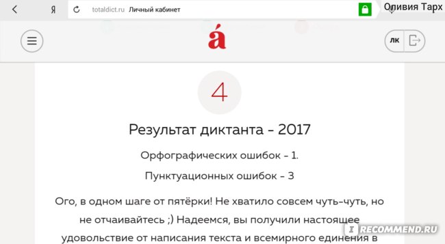 Реальная возможность повысить грамотность . «В этом году количество пятерок, которые получили участники, выросло до 10% на фоне обычных 2–3%, - рассказывает Ольга Ребковец, руководитель проекта «Тотальный диктант». - Мы объясняем это тем, что участники стали активнее готовиться к диктанту на наших очных и онлайн-курсах».