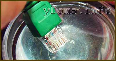 В небольшую емкость из диэлектрического материала (стекло, пластик, полиэтиленовый пакет) налить немного воды с растворенной в ней поваренной солью из расчета четверть объема соли от объема воды. Чем соли больше, тем лучше. Соль добавляется в воду, чтобы уменьшить ее электрическое сопротивление. Погрузить все проводники одного конца кабеля в емкость с раствором. Можно погружать каждую витую пару и по очереди. Расстояние между проводниками витых пар должно быть минимальным, но соприкасаться они не должны.