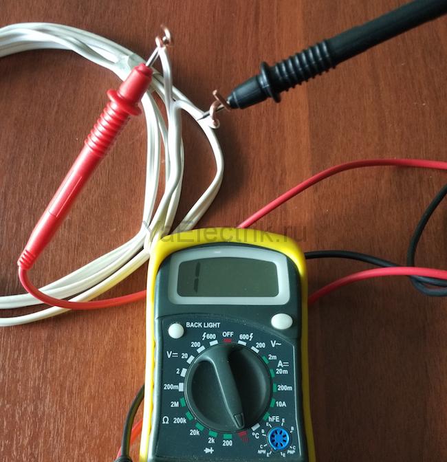 Проверяем нет ли короткого замыкания между жилами кабеля. Если на индикаторе «1» и нет звукового сигнала, значит все в порядке, иначе — короткое замыкание.