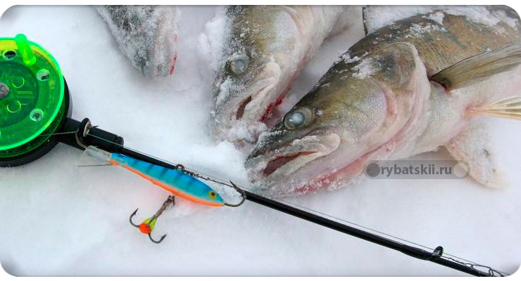 В ловле клыкастого хищника со льда зарекомендовали себя узкие блёсны красного, жёлтого и серебристого цвета. По длине приманки могут быть разными. Чаще всего используют блёсны в пределах 4–12 см. Вес подбирается с учётом условий ловли: в стоячей воде можно ставить относительно лёгкие модели (до 10 г), на течении лучше показывают себя тяжёлые (20–50 г).