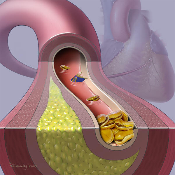 При атеросклерозе опасность представляют тромбы. Это не что иное, как небольшие фрагменты липидных отложений, отделившихся от стенок сосудов. С током крови они проходят по сосудам и артериям и в определенных участках могут создавать препятствие нормальному кровообращению. Возникает закупорка артерии тромбом, кровообращение нарушается, развивается инфаркт миокарда или инсульт.