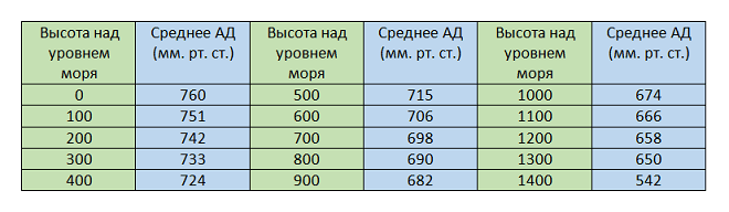 В наш век интернета узнать оптимальный показатель для своей зоны проще простого. Достаточно зайти на любой сайт погоды и высчитать средние значения. Кому лень заморачиваться с такими подсчетами, может найти в Википедии сайт о своем городе, где обозначено его расположение над уровнем моря, и исходя из этих данных отследить среднее АД по следующей таблице.