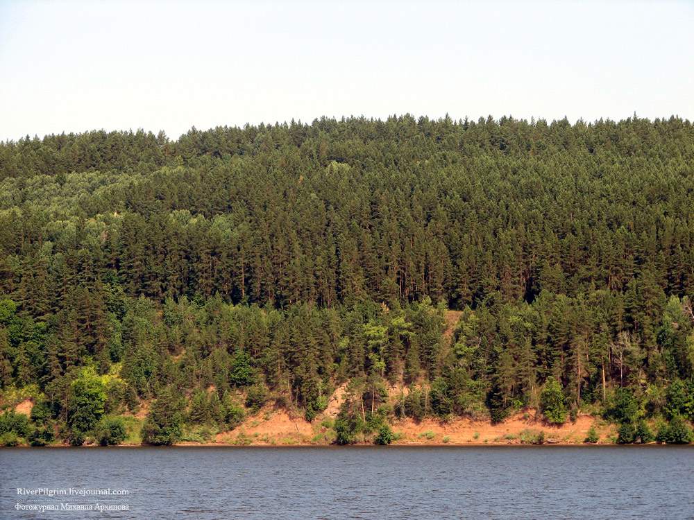 Но недолго идет этот красивый крутой берег. Скоро он снова отходит от реки, и вдоль русла реки, почти до пристани Тихие Горы, тянется однообразный пойменный берег. Здесь к берегу приближается массив коренных пород (Тихие горы), который тянется вдоль Камы в виде хребта, шириною около 2 км, очень круто обрывающегося к ней, и полого спускается к широкой долине Тоймы. Река эта течет параллельно Каме, но выходит в камскую долину ниже Тарловки, а впадает в Каму почти у самой Елабуги.