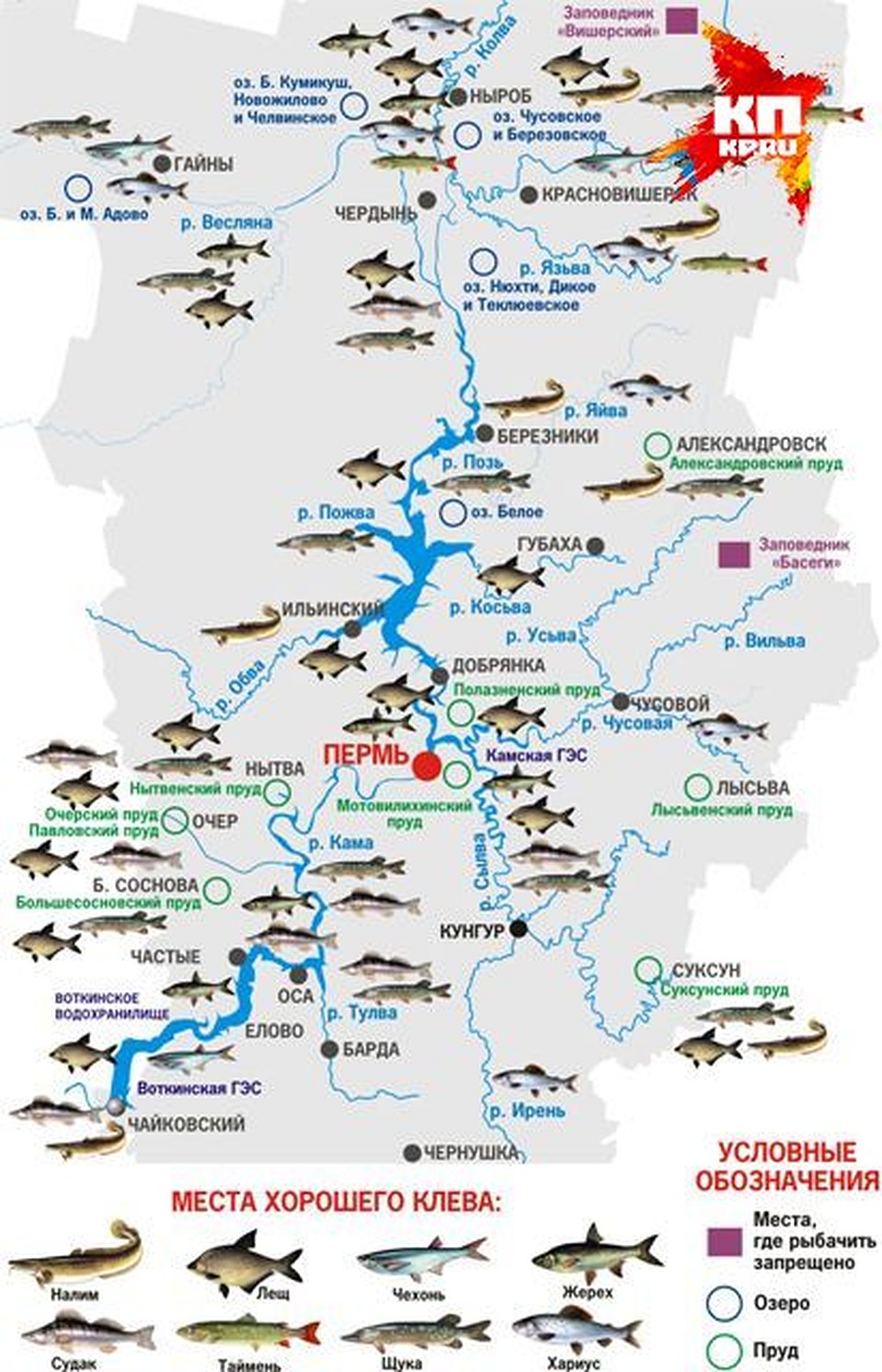 В основном ловят окуня, леща, ерша, налима, густору, плотву, реже — судака, налима и щуку. Куда же лучше всего поехать за царским уловом? Карту самых «клевых» мест нам помогла составить начальник отдела мониторинга водных биоресурсов, органов рыболовства и ихтиологии ФГБУ «КамУралРыбвод» Татьяна Лесникова.