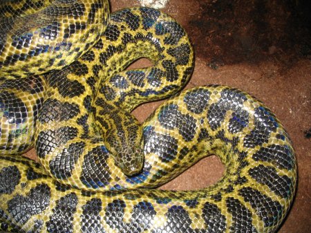 Зеленоватый оттенок этой змеи также сыграл роль в ее названии. Анаконды всех видов имеют на своем теле округлые и продолговатые пятна. Самой яркой окраской славится парагвайская анаконда. Ее желтое тело украшено синими пятнами.