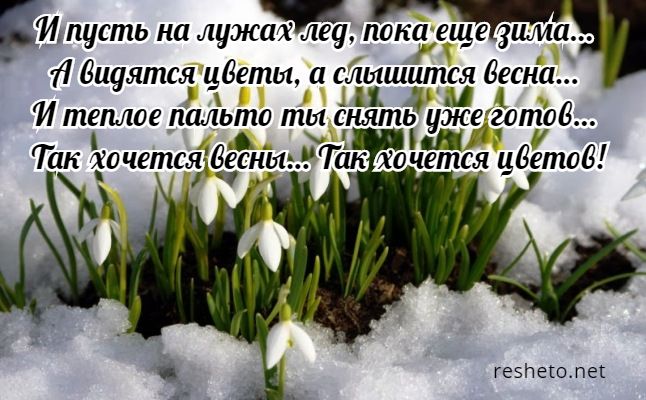 Если тебе удавалось пережить зиму, наступала весна. Весна — время менять пальто, обои и вредные привычки. Только сейчас вдруг дошло, что через полторы недели настанет весна. А к весне всегда все неимоверно сказочно, это можете спросить у любого шизофреника. Февраль отступает черным ходом, у парадной двери ждет весна. Самое время для перемен. Весна – единственная революция на этом свете… Ожидание весны – это как ожидание рая. Февраль всегда полон надежд. Февраль — это практически весна! А весной возможно абсолютно все. Весна — растворитель зимы. Нужно всегда идти вперед, помня, что после зимы всегда наступает весна. Весна подарит нам стимулы жить. Весеннее настроение может быть и зимой. Особенно в феврале. Ведь календарь на стене настойчиво подсказывает, что скоро первое марта, и календарное начало весны гарантировано. Конечно, у погоды могут быть свои планы на этот счет. Но долго противиться весне и она не сможет.