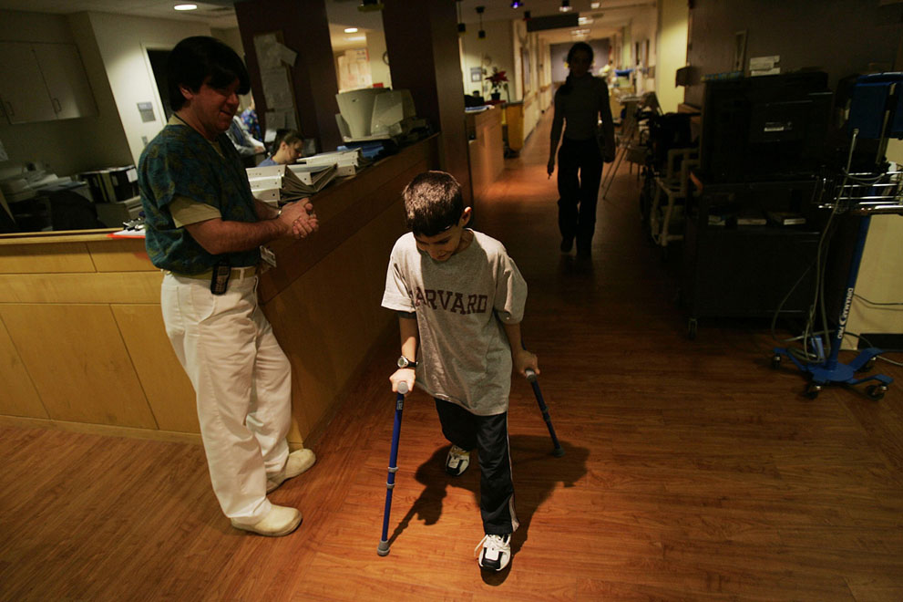 (2 из 2) Ракан Хасан, в реабилитационном госпитале в Бостоне, штат Массачусетс, 11 января 2006 года. Родители Ракана были застрелены, а он был тяжело ранен солдатом 18 января 2005 года в северном иракском городе Таль-Афар. Инцидент получил широкую огласку, и в конечном итоге способствовал переезду и лечению Ракана в Бостоне. У мальчика был поврежден нерв и врачи думали, что он никогда не будет ходить, но интенсивная терапия позволила Ракану снова встать на ноги. (Chris Hondros / Getty Images)