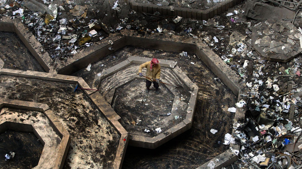Строитель убирает мусор внутри разрушенного дома в Багдаде, 11 декабря 2003. (Joe Raedle / Getty Images)