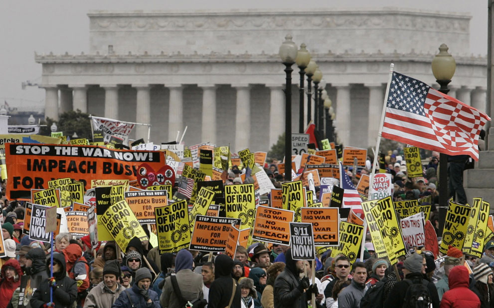 Тысячи демонстрантов на фоне Мемориала Линкольна 17 марта 2007 года во время акции протеста против войны в Ираке. (AP Photo / Gerald Herbert)