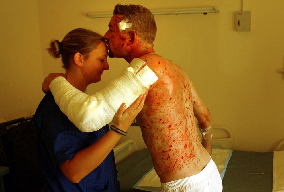 Британский военный Михаель Фитцпатрик и медсестра Джейми Бай в американском военном госпитале в Багдаде, 15 октября 2004 года. Фицпатрик сказал, что он пил кофе в зеленой зоне, когда террорист-смертник взорвал бомбу, убившую 6 человек. (AP Photo / John Moore)