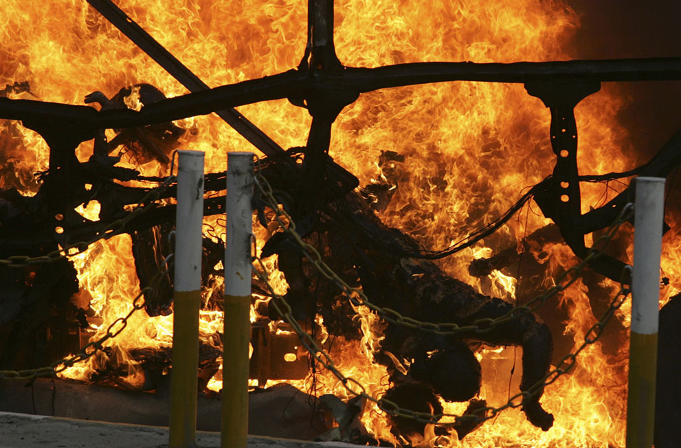 Горящий человек в микроавтобусе, вскоре после теракта в Багдаде, 21 января 2007 года. Бомба убила двух человек, её взорвал семилетний смертник в центре Багдада, сообщает полиция. (Reuters / Намир Нур-Элдин)