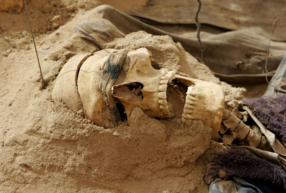 Человеческий череп с завязанными глазами лежит на братской могиле. В могиле множество человеческих останков, американские власти утверждают, что эти люди были убиты во время режима бывшего президента Саддама Хусейна и сейчас обнаружены в неглубокой могиле, в отдаленной пустыне к югу от Багдада в Ираке в июне 2006 года. (AP Photo / Эрик де Кастро)