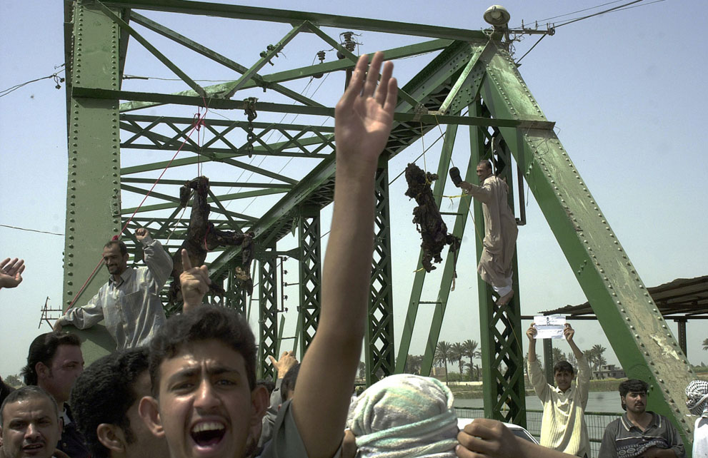 Фото сделано 31 марта 2004, иракцы скандируют антиамериканские лозунги, на фоне обугленных тел, свисающих с моста через реку Евфрат в Фаллудже, к западу от Багдада. Конвой, содержащий американских военных принадлежащих частной военной компании Blackwater USA, попал в засаду, все военные были убиты. (AP Photo / Khalid Mohammed, File)