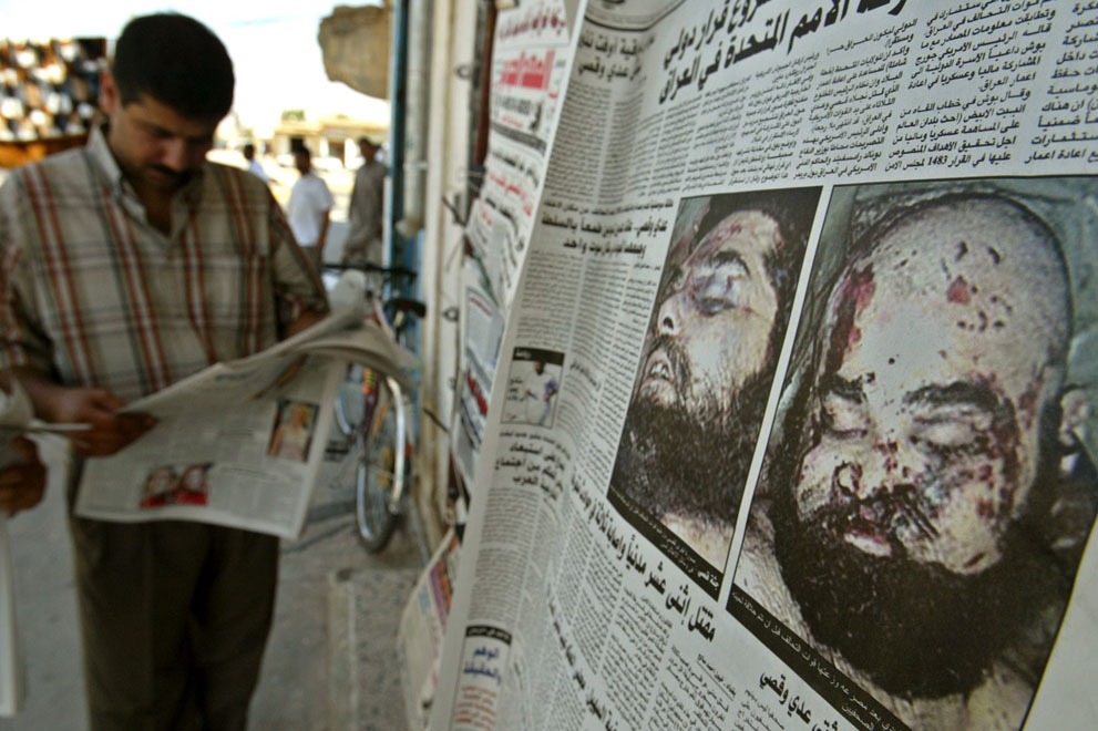 Мужчина читает иракскую газету в северном городе Тикрит после того, как убили сыновей Саддама Хусейна, и снимки мертвых Удея и Кусея были опубликованы в первый раз, 26 июля 2003 года. В надежде убедить иракцев, что они мертвы, американские военные опубликовали фотографии в четверг и позволили небольшой группе средств массовой информации продублировать их в своих изданиях. (Reuters / Фалех Кхейбер)
