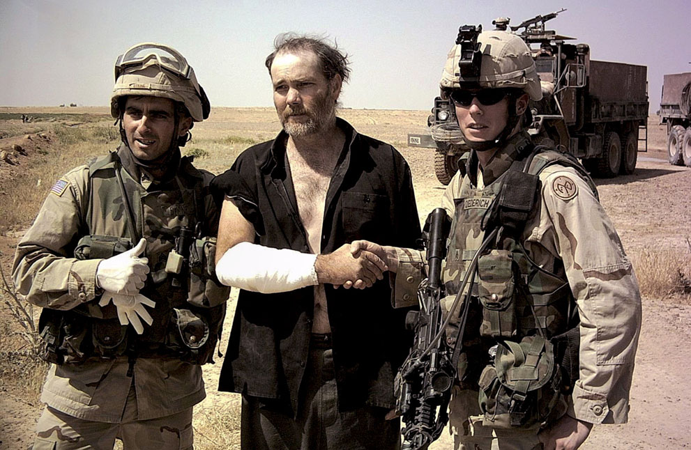 На изображении свергнутый иракский лидер Саддам Хусейн, его тащат из укрытия после захвата войсками США, 13 декабря 2003 года. Саддам был пойман недалеко от своего родного города Тикрита на севере Ирака. Это одна из фотографий, сделанных в американской армии незаконно, сразу же после поимки лидера, несколько подобных снимков заполонили интернет. Человек, который держит его в руках, как позже выяснилось, американец, иракского происхождения, по имени Самир, работавший переводчиком. (AFP / Getty Images)