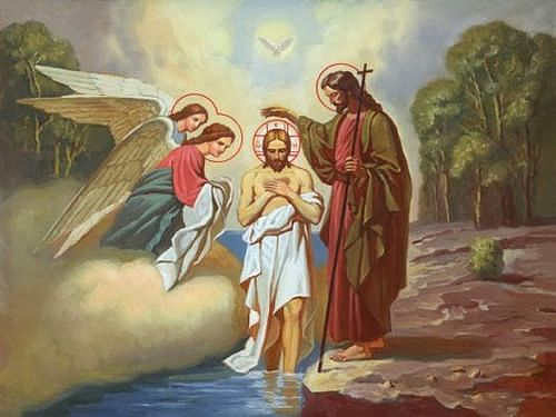 Иоанн Креститель, призывая народ к покаянию, крестил людей в Иордане, очищая их души. Поскольку Сын Божий был безгрешен, он согласился на обряд по смирению своему и освятил тем самым все водное естество. Иисусу Христу било тридцать лет, когда он пришел из Назарета, чтобы Иоанн Креститель крестил его. Как только Сын Божий вышел из воды, над головой разверзлись небеса и прозвучал глас Господа: «Сей есть Сын Мой возлюбленный, в Котором Моё благословение». Из небесной выси явился Святой Дух Божия в виде светлой птицы — голубя.