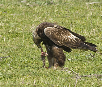С добычейВне сезона размножения обычно охотится парами. Техника добычи пищи во многом зависит от погоды. В ясный солнечный день орёл чаще всего подолгу парит высоко в небе или подобно тетеревятнику скользит на малой высоте. Другой вариант охоты больше характерен для ненастного дня — из засады, когда птица терпеливо обозревает окрестности с высоты мёртвого дерева или крупного валуна. Приметив потенциальную жертву, орёл переходит на быстрый и маневренный машущий полёт либо пикирует с частично сложенными крыльями, хватает её на земле либо, в случае птицы, иногда на взлёте. Способ захвата и умерщвления добычи варьирует. Чаще всего беркут одной лапой хватает жертву за голову, а второй за спину, пытаясь переломить позвоночник. Иногда бьёт дичь в шею острым клювом, разрывая крупные сосуды. Сопротивляющееся крупное животное ударяет несколько раз, с помощью крыльев балансируя на его спине.