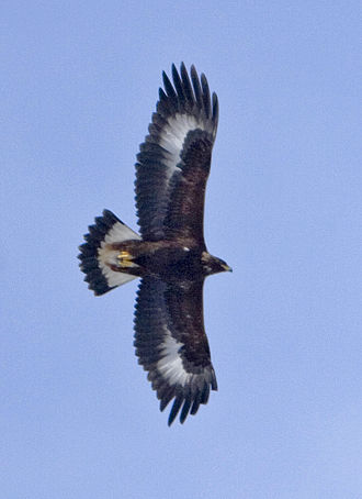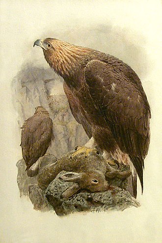 Беркут ( Aquila chrysaetos) — одна из наиболее известных хищных птиц семейства ястребиных, самый крупный орёл. Распространён в северном полушарии, где обитает преимущественно в горах, в меньшей степени на равнинных открытых и полуоткрытых ландшафтах. Избегает жилых районов, чувствителен к беспокойству со стороны человека. На большей части ареала живёт оседло, держится парами возле гнезда, на северной периферии области распространения и высокогорья часть птиц откочёвывает в менее снежные районы. Охотится на самую разнообразную дичь, чаще всего зайцев, грызунов и многие виды птиц. Иногда нападает на овец, телят и детёнышей оленей. Гнездо устраивает на дереве либо на труднодоступном скалистом уступе. В кладке обычно два яйца, однако чаще всего выживает только один птенец.